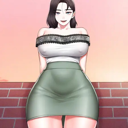 2. ((正式,无袖白色上衣,荷叶边边缘,蓝色铅笔裙,))