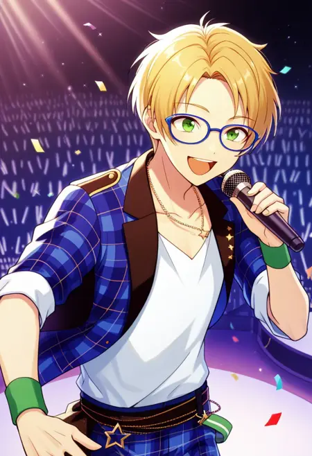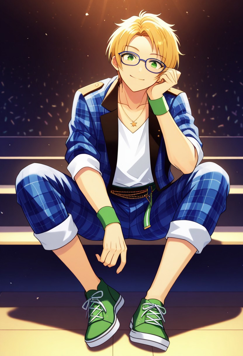 makoyuk, 1boy, 男性焦点, シングル, 緑色の目, 金髪, 短髪, めがね, 青枠の眼鏡, Trickstarユニフォーム, ジュエリー, ネックレス, シャツ, 白いシャツ, クラビングボーン, ジャケット, 青いジャケット, チェック柄ジャケット, オープンジャケット, オープンクローズ, 袖まくり, ワイストバンド, ベルト, 星(シンボル), パンツ, 青いパンツ, チェック柄パンツ, パンツまくり, チェック柄, 靴, スニーカー, 緑色の足元,