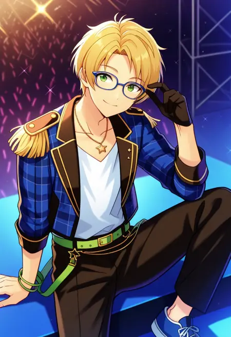 makoyuk, 1boy, 男性焦点, シングル, 緑色の目, 金髪, 短髪, めがね, 青枠の眼鏡, Trickstarユニフォーム, ジュエリー, ネックレス, シャツ, 白いシャツ, クラビングボーン, ジャケット, 青いジャケット, チェック柄ジャケット, チェック柄, 肩章, オープンジャケット, オープンクローズ, ブレスレット, 手袋, 黒い手袋, 片手の手袋, ベルト, 緑色のベルト, パンツ, 黒いパンツ, 星(シンボル), 靴, スニーカー, 黒と青の足元,
