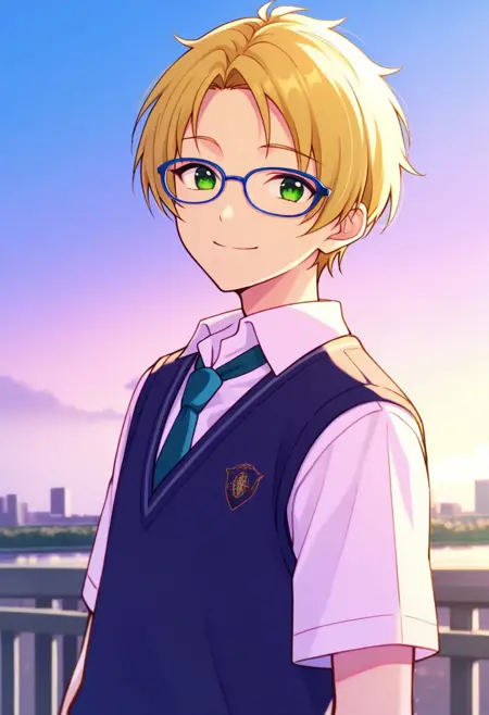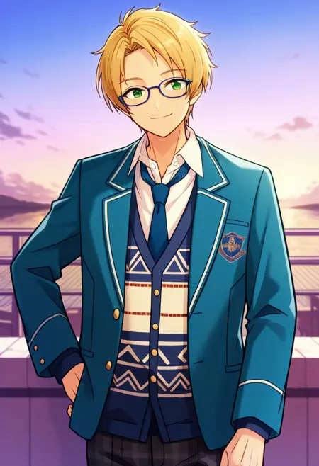 makoyuk, 1boy, 男性焦点, シングル, 緑色の目, 金髪, 短髪, めがね, 青枠の眼鏡, 学校制服, シャツ, 白いシャツ, ボタンシャツ, ネクタイ, 青いネクタイ, ベスト, セーターベスト, 多色ベスト, イギリス国旗模様, ジャケット, ブレザー, 青いジャケット, 長袖, オープンジャケット, オープンクローズ, パンツ, 黒いパンツ, チェック柄パンツ, チェック柄, 靴, 茶色の足元,