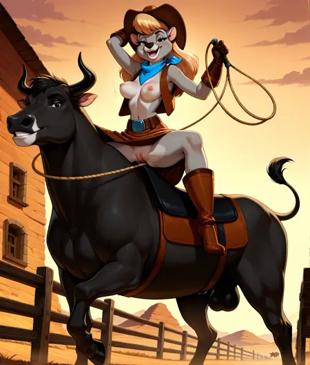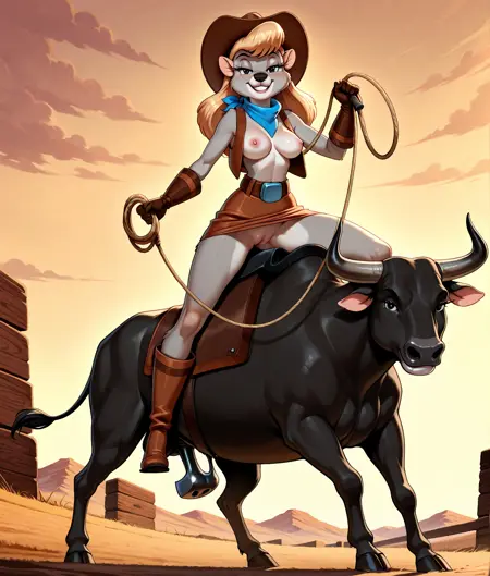 cowboy hat, brown vest, brown headwear, blue neckwear, open vest, clementine_outfit, pink shirt, long sleeves, brown gloves, long eyelashes, brown belt, brown skirt, belt buckle,