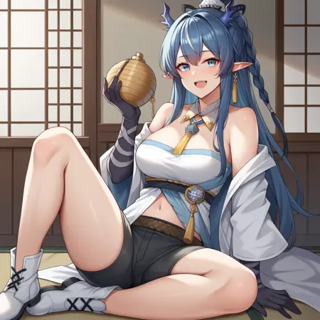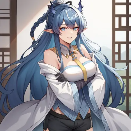 Ling_Ark, long hair, blue hair, blue eyes, streaked hair, white hair, braid, dragon horns, dragon tail, pointy ears,