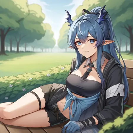 Disclaimer: I'm not entirely sure which eye color she has for each outfit to be honest. There are some artworks with blue eyes and some with purple eyes. I didn't train on her eyes specifically so you should be able to switch between any eye color you want. I prefer blue eyes though.