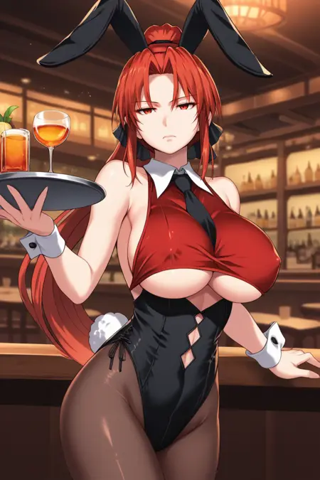 Bunny waitress: black bunnysuit, red top, shirt collar, necktie, sleeveless, covered erect nipples, underboob, wrist cuffs, pantyhose,