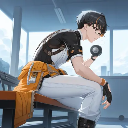 双色衬衫, 黑色衬衫, 白色衬衫, 夹克系在腰部, 橙色夹克, 卷起袖子, 短袖, 黑色手套, 白色裤子, 腰带, 胸部束带, 肩部束带,