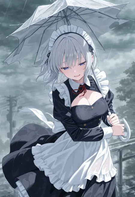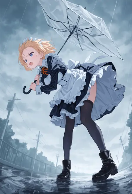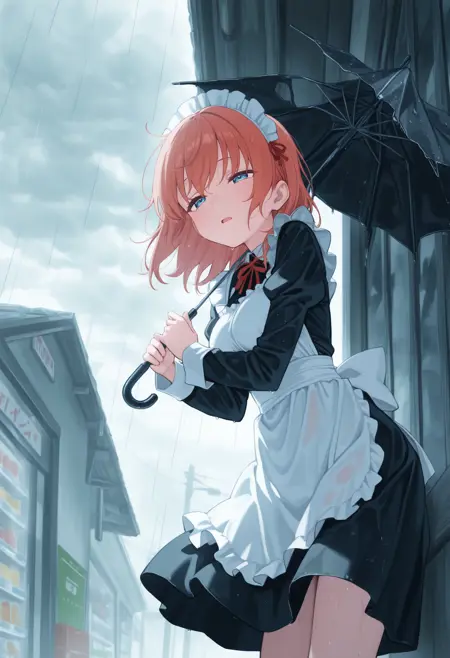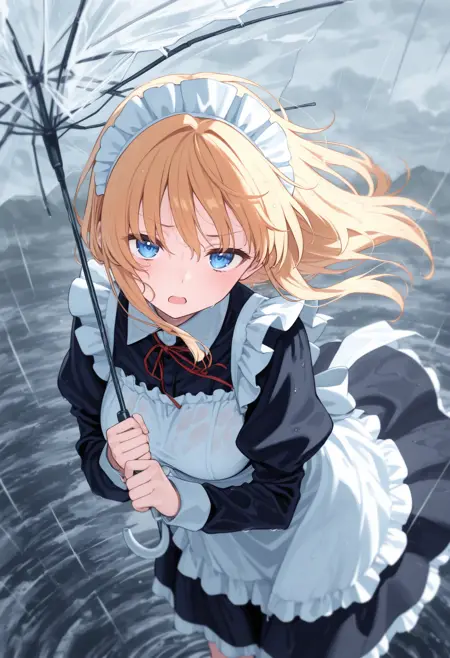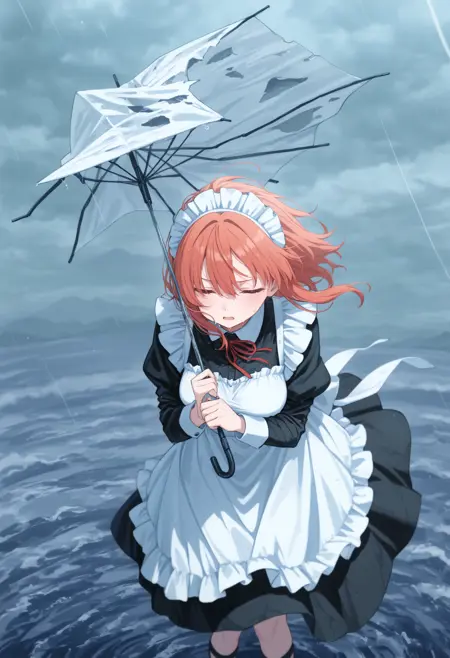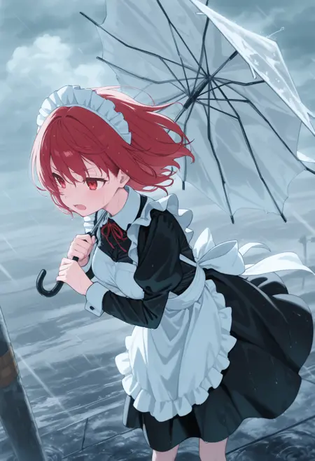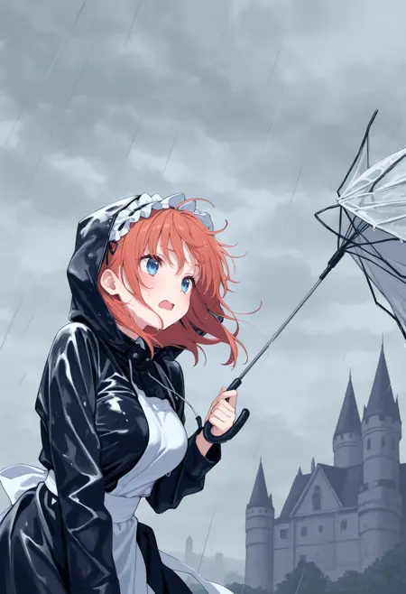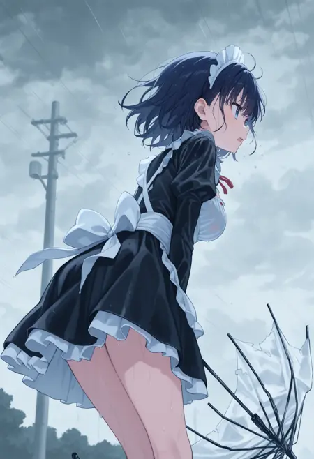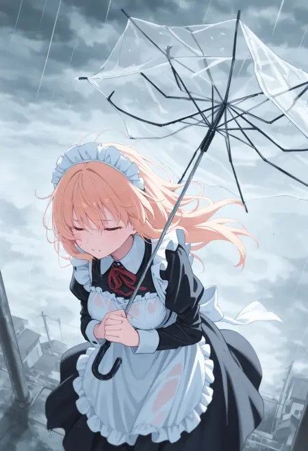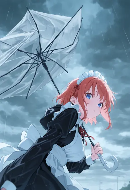 如果只是让角色拿着一把坏掉的伞,可能会让人困惑“这是什么?”,建议从以下关键词中选择你喜欢的加入:umbrella、holding umbrella、cloudy sky、floating hair、leaning to the side、typhoon、storm、raincoat、rain、outdoors、wet、wind、wind lift、leaning forward,这样更能体现出强风的感觉。