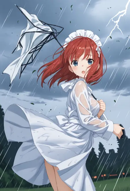 如果只是让角色拿着一把坏掉的伞,可能会让人困惑“这是什么?”,建议从以下关键词中选择你喜欢的加入:umbrella、holding umbrella、cloudy sky、floating hair、leaning to the side、typhoon、storm、raincoat、rain、outdoors、wet、wind、wind lift、leaning forward,这样更能体现出强风的感觉。