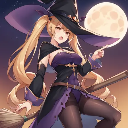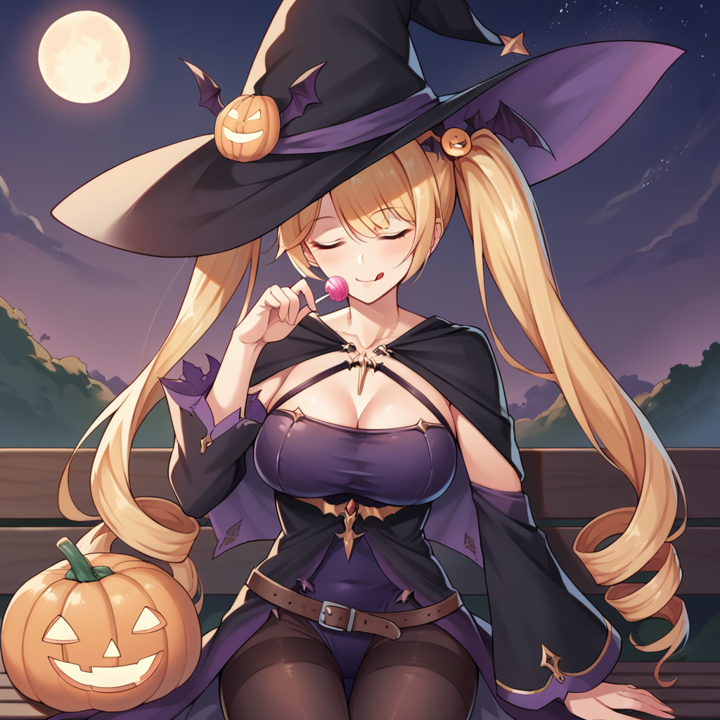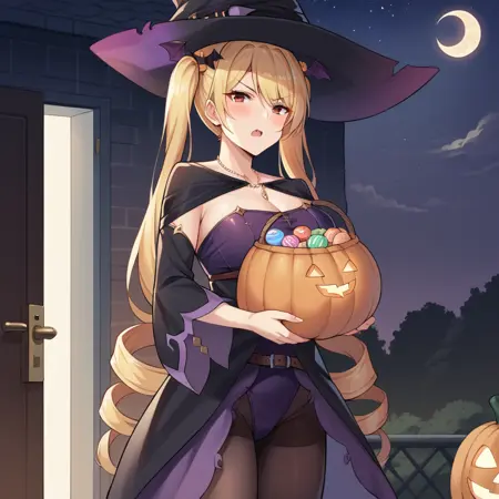 NelsonAzur, Fol001, Nel_Hal, 금발 머리, 긴 머리, 붉은 눈, 더블테일, 드릴 머리, 할로윈 의상, 보라색 레오파드, 허벅지 팬티스타킹, 검은 팬티스타킹, 할터 레오파드, 여러 개의 벨트, 보라색 벨트, 허벅지 벨트, 느슨한 벨트, 빨간 보석, 젖가슴, 금 할터넥, 보석, 박쥐 머리 장식, 마녀 모자, 검은 머리 장식, 펜던트 초커, 보라색 캐플릿, 이-ton 캐플릿, 검은 캐플릿, 분리형 소매, 하이웨이스트 스커트, 오픈 스커트, 검은 스커트, 배꼽 가림, 층층이 소매, 넓은 소매, 검은 소매, 보라색 장식, 젖가름 컷아웃,