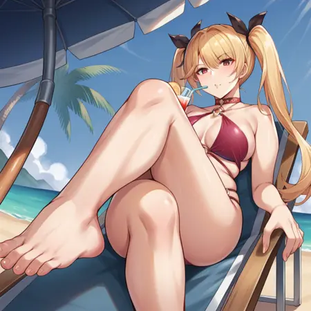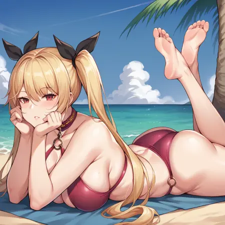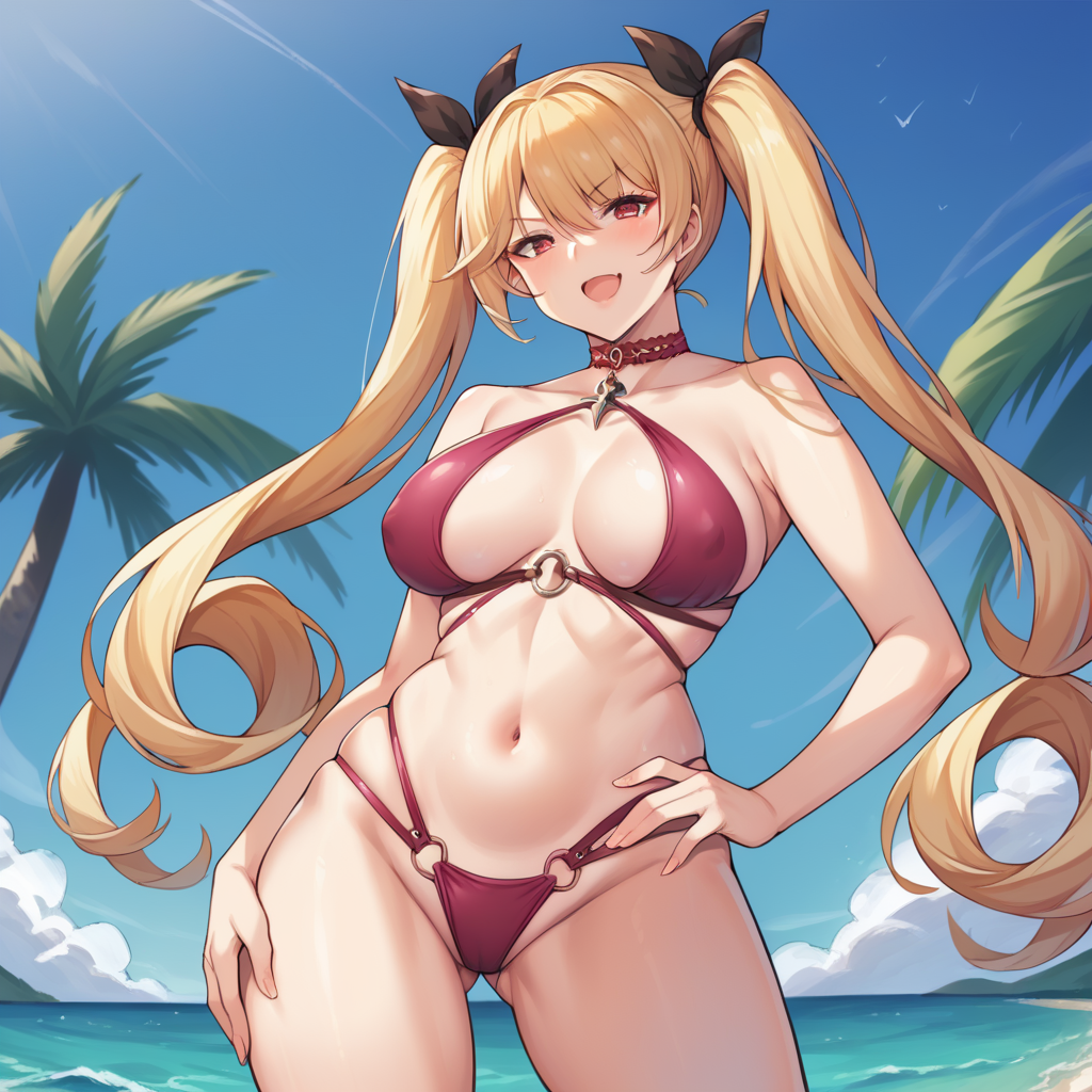 NelsonAzur, Fol003, Nel_Swm, 금발 머리, 긴 머리, 붉은 눈, 더블테일, 드릴 머리, 머리 리본, 검은 리본, O-링, O-링 비키니, 빨간 비키니, 멀티 스트랩 비키니 바지, 빨간 초커, 할터 비키니 상의,