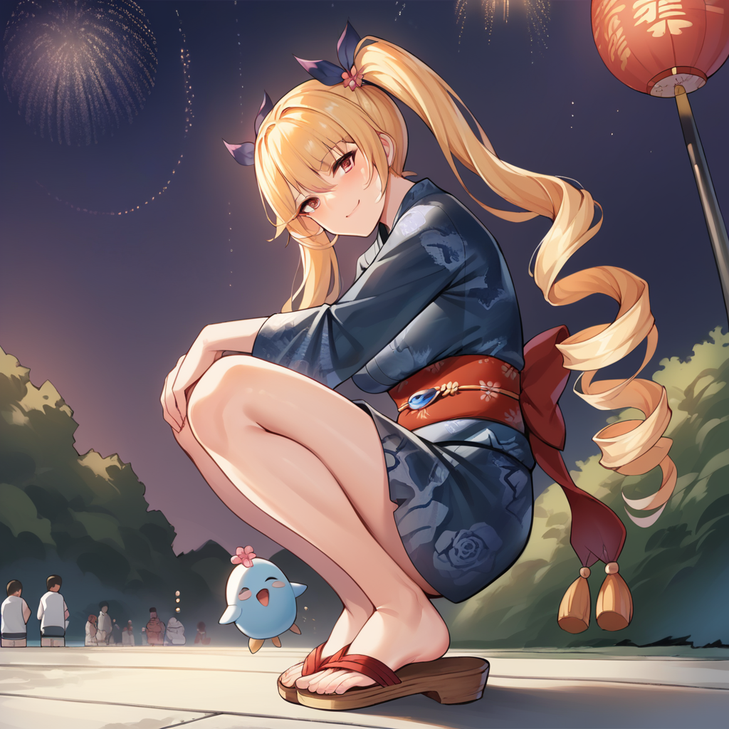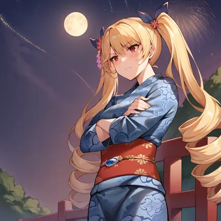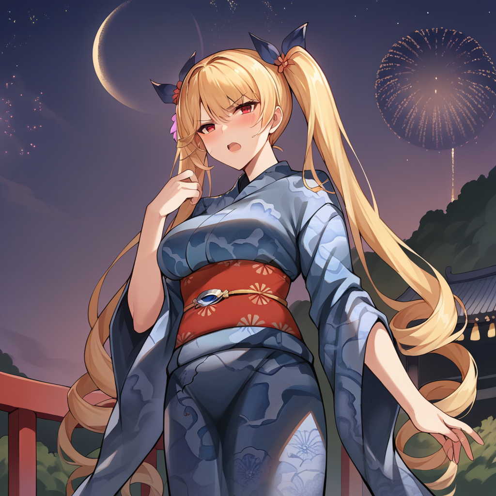 NelsonAzur, Fol002, Nel_JP, 금발 머리, 긴 머리, 붉은 눈, 분홍 꽃, 머리 꽃, 파란 리본, 머리 리본, 더블테일, 드릴 머리, 프린트 키모노, 파란 키모노, 유카타, 일본 옷, 파란 넓은 소매, 플로럴 프린트, 빨간 띠, 파란 보석,