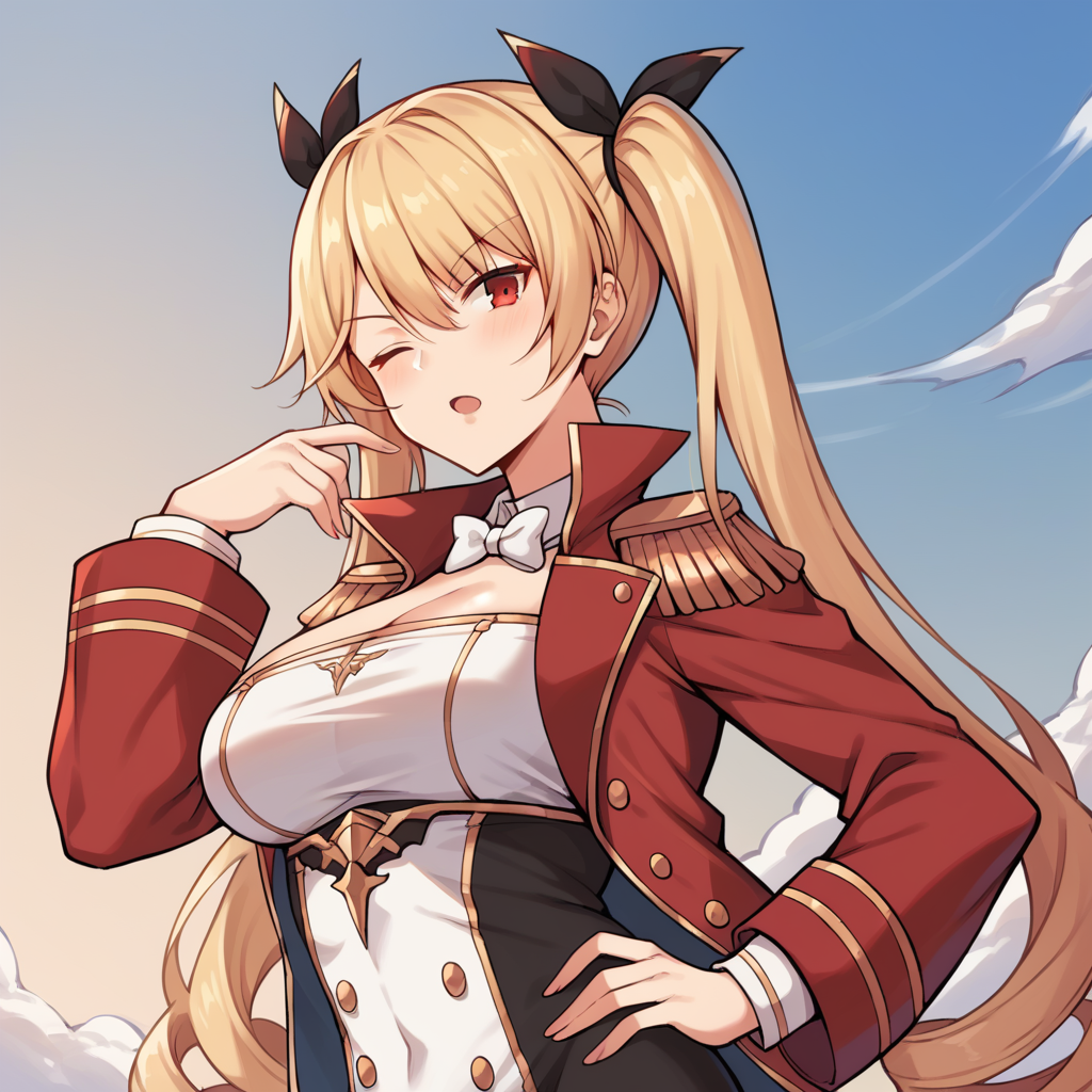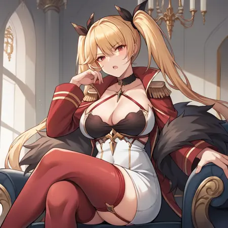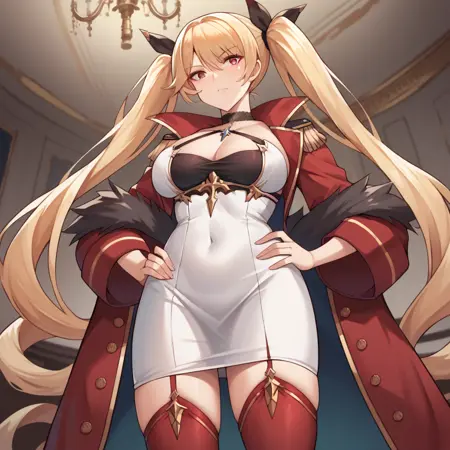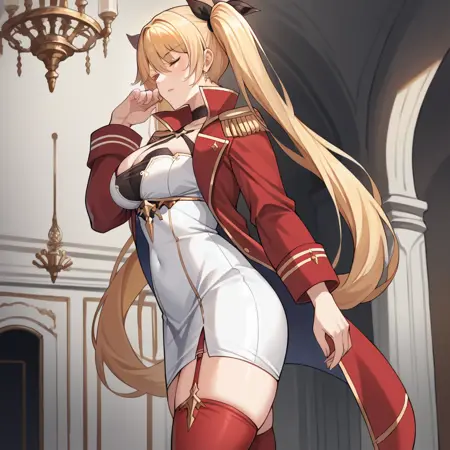 NelsonAzur, Fol001, Nel_Def, 금발 머리, 긴 머리, 붉은 눈, 더블테일, 드릴 머리, 검은 리본, 더블브레스트, 검은 드레스, 흰 드레스, 이-ton 드레스, 짧은 드레스, 마이크로 드레스, 오픈 재킷, 스트랩리스 드레스, 흰 리본, 리본, 빨간 재킷, 군복 재킷, 높은 칼라, 젖가슴, 어깨장식, 허벅지 부츠, 빨간 다리옷, 긴 소매, 빨간 소매, 흰 소매 단, 금장식, 흰 분리형 칼라,