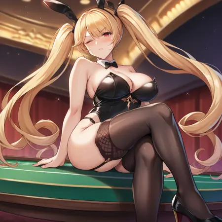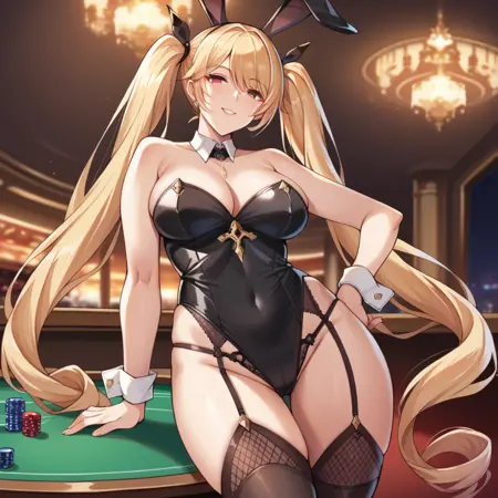 NelsonAzur, Fol003, Nel_Bny, 금발 머리, 긴 머리, 붉은 눈, 더블테일, 드릴 머리, 머리 리본, 하이레그, 빨간 보석, 검은 칼라, 브로치, 빨간 펜던트, 토끼 귀 머리띠, 검은 레깅스, 분리형 레깅스, 라텍스 다리옷, 스트랩리스 레오파드, 검은 레오파드, 레이스 게터 벨트, 게터 스트랩, 레이스 허벅지부츠, 층층이 다리옷, 검은 분리형 칼라, 검은 허벅지부츠,