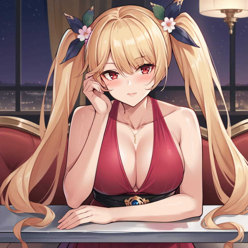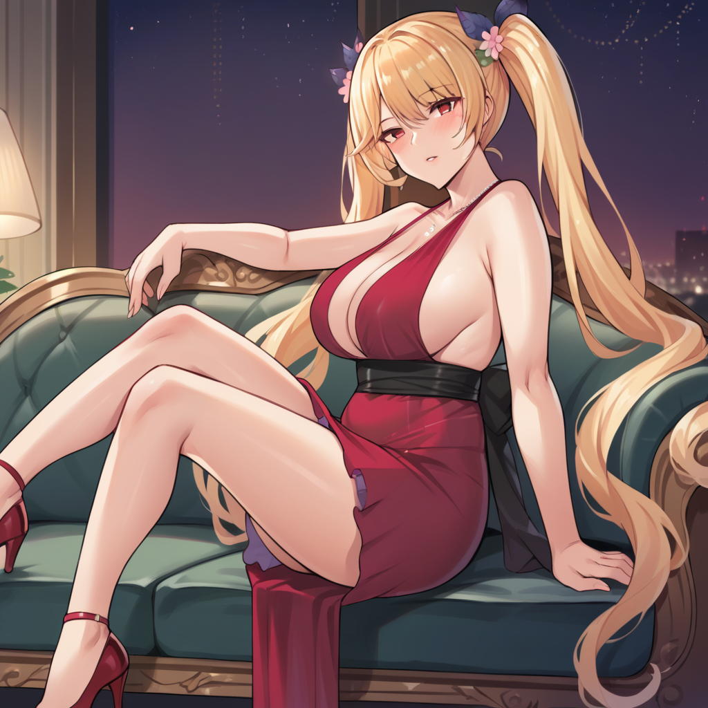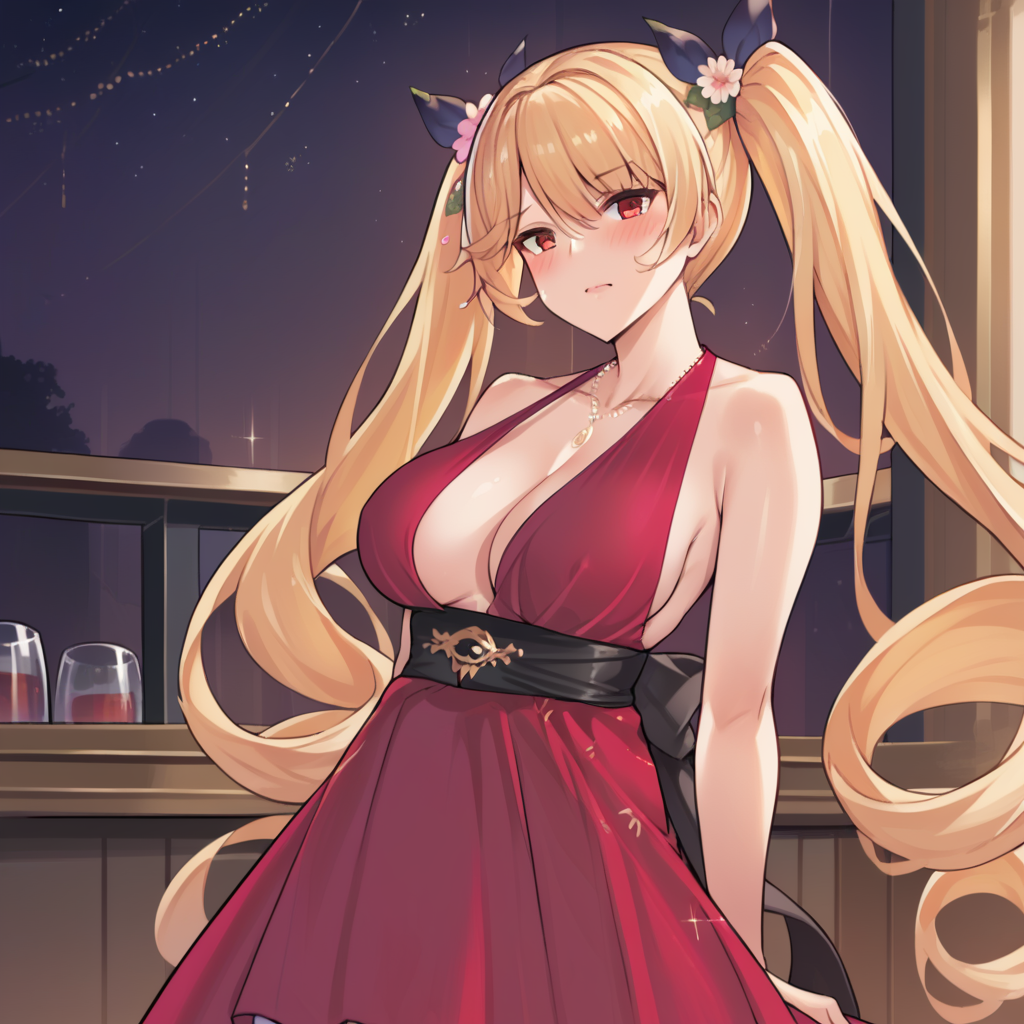 NelsonAzur, Fol004, Nel_Rdr, 금발 머리, 긴 머리, 붉은 눈, 더블테일, 드릴 머리, 빨간 드레스, 레이스 초커, 빨간 장미, 검은 초커, 꽃 머리 장식, 검은 띠, 허리 리본, 검은 리본, 프릴 스커트, 빨간 스커트, 사이드부브, 젖가슴, 반장갑, 검은 장갑, 어깨 드러냄, 소매 없는 드레스, 중앙 오픈, 빨간 할터 상의,