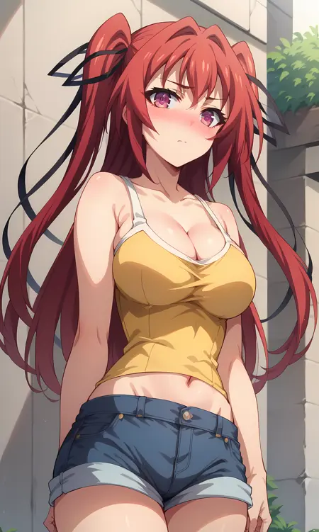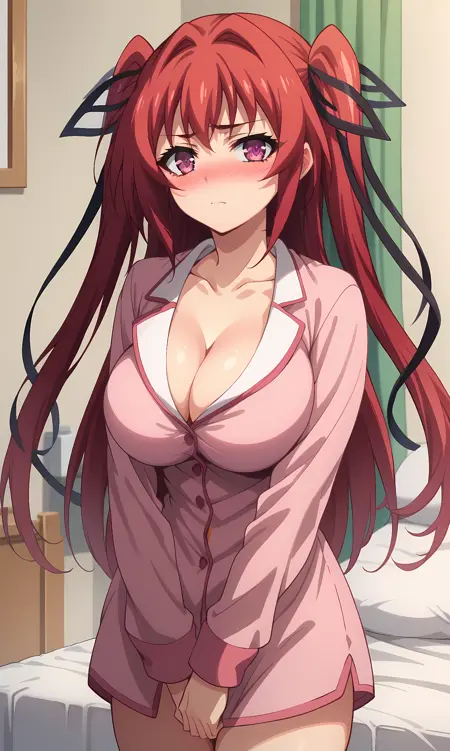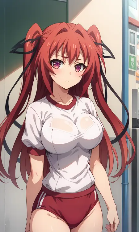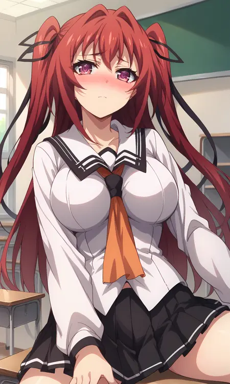 미오 나루세, 보라색 눈, 빨간 머리, 긴 머리, 양옆으로 올린 머리, 검은 리본, 헤어 리본