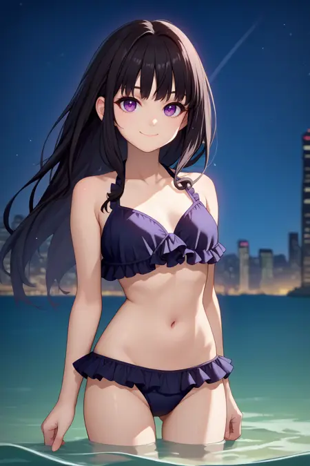 외모: inetkn, 긴 머리, 검은 머리, 보라색 눈