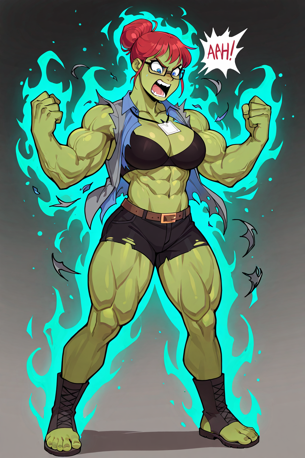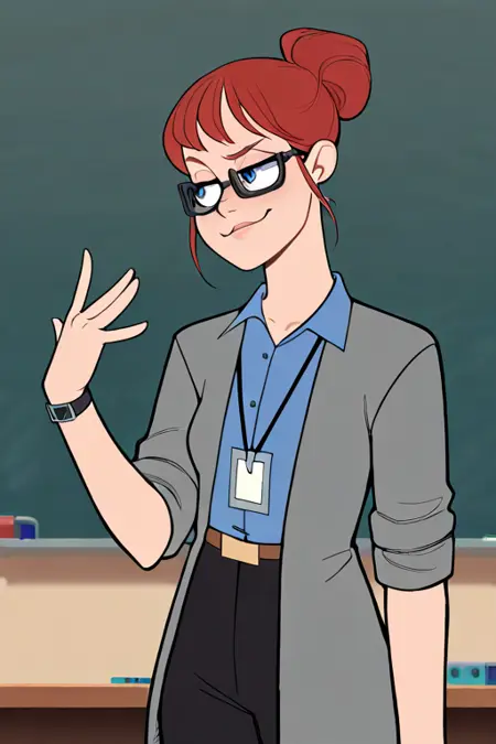 프롬프트: 조시린, 빨간 머리, 파란 눈, 안경, 회색 재킷, 파란 셔츠, 이름표, 벨트, 검은 바지