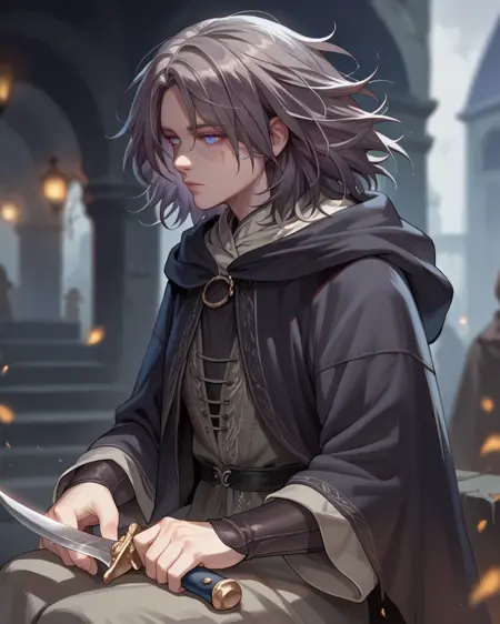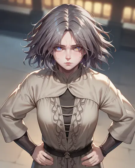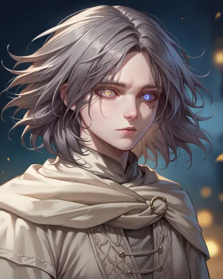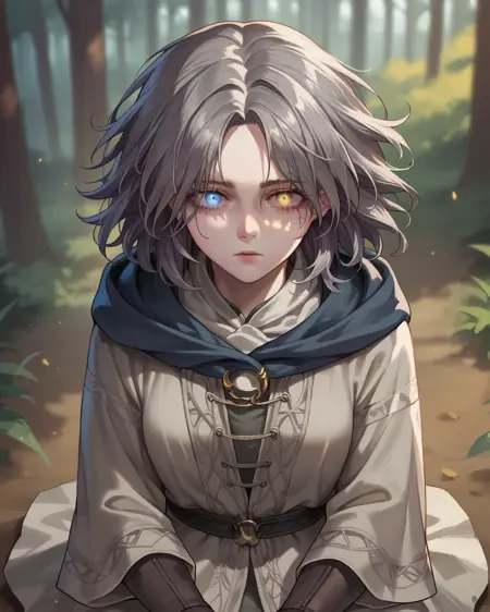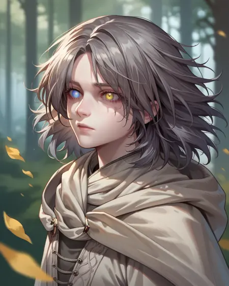 触发词:DarkMelina,兜帽,灰发,疤痕,蓝色瞳孔,黄色瞳孔,虹膜异色,