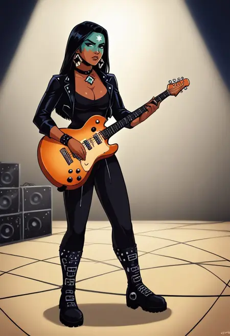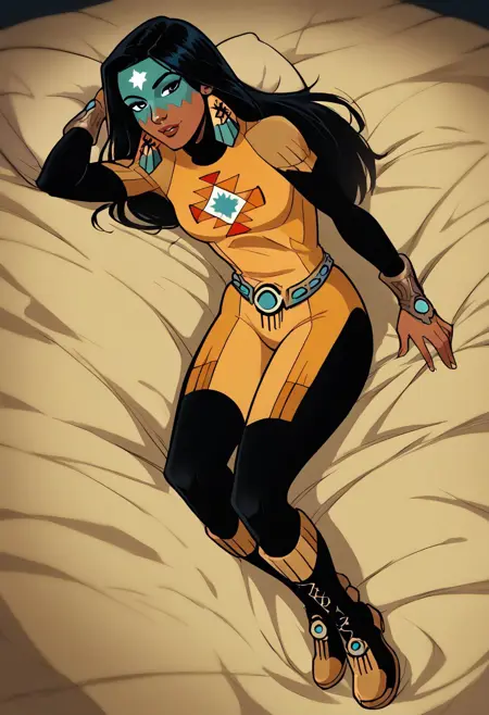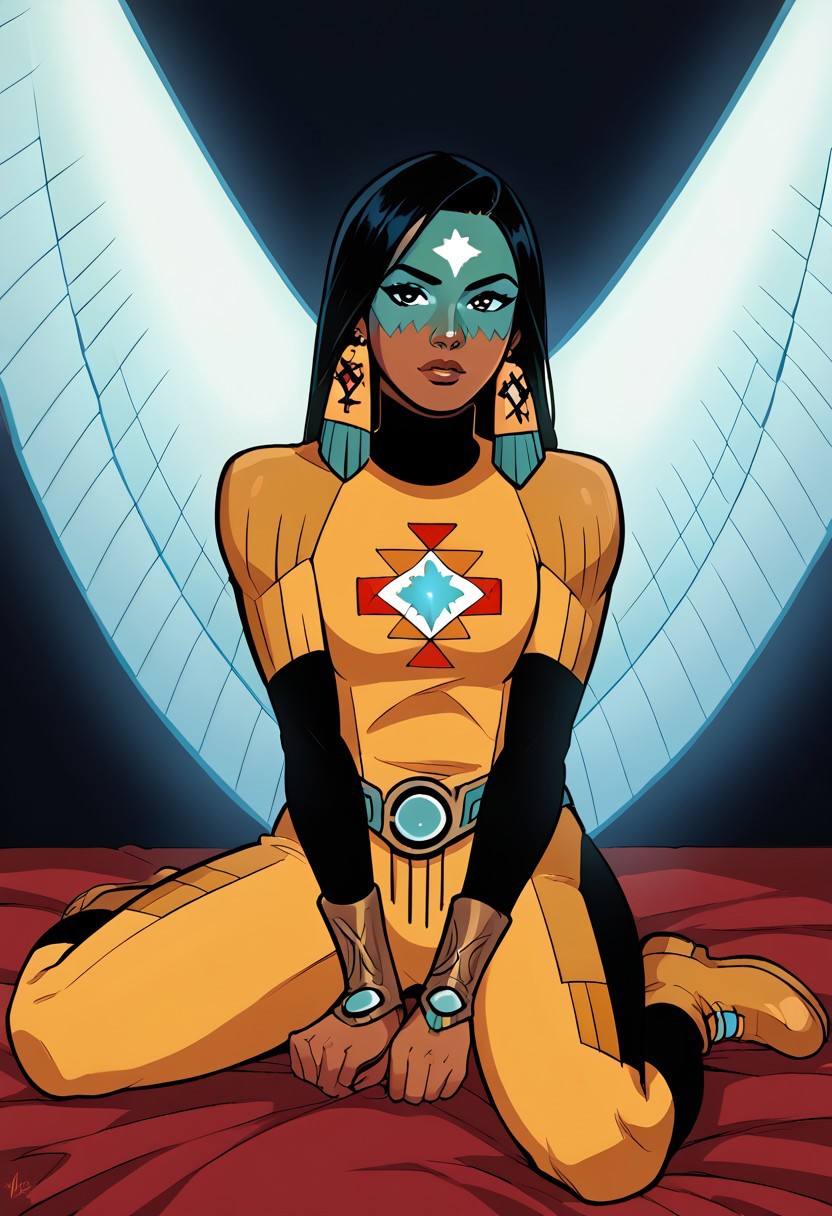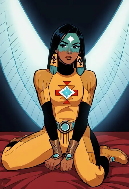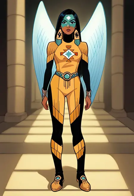 通用提示:DSf,深色皮肤,黑发,长发,黑眼睛,面部彩绘,星形面部标记,耳环,珠宝,高领,多色紧身衣,黄色紧身衣,黑色紧身衣,护臂,腰带,靴子,发光的蓝色翅膀,