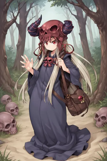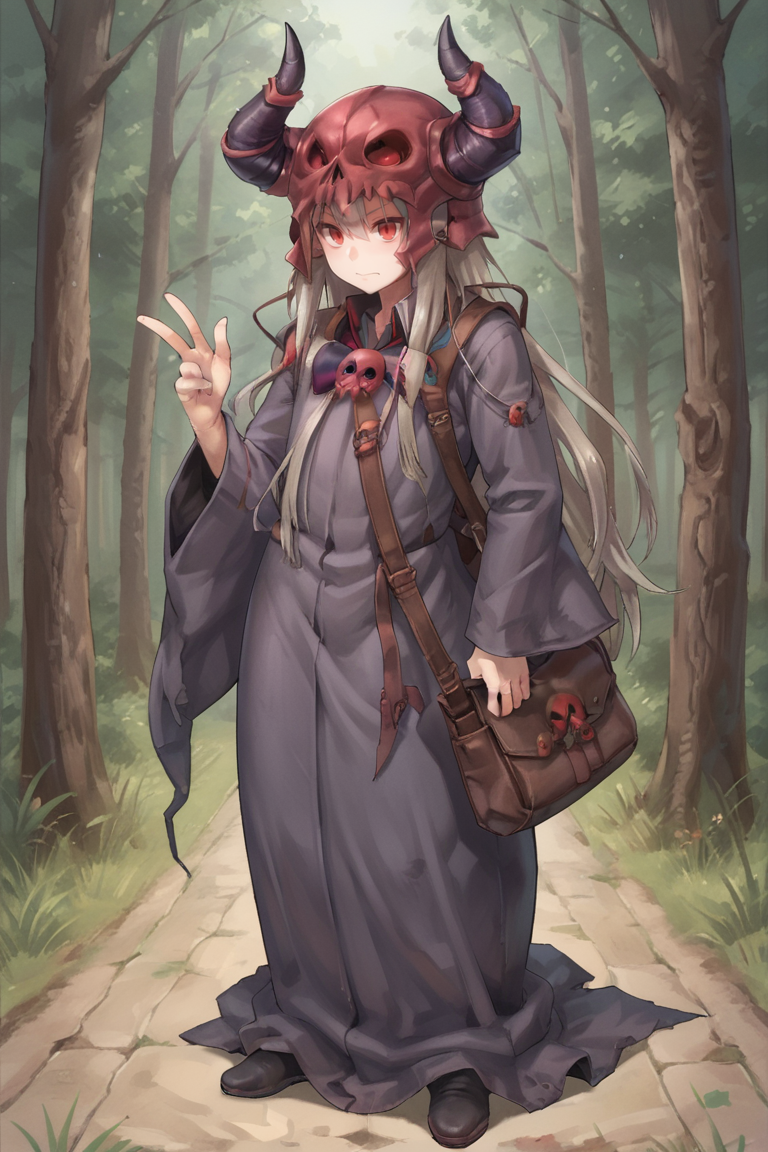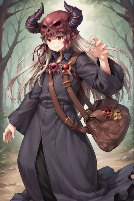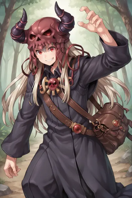 유용한 태그: 1boy, 빨간 눈, 긴 머리, 회색 머리, 뿔 달린 헬멧, 두개골 핀, 로브, 긴 소매, 가방,