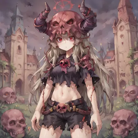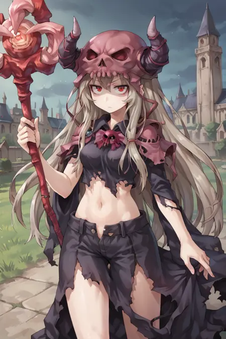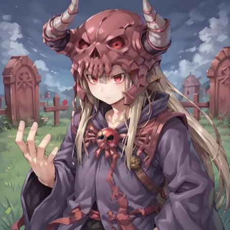 유용한 태그: 1man, 1boy, 긴 머리, 빨간 눈, 회색 머리, 두개골, 뿔 달린 헬멧, 보라색 헬멧, 뿔, 가짜 뿔, 검은 카페트, 검은 로브, 가방,