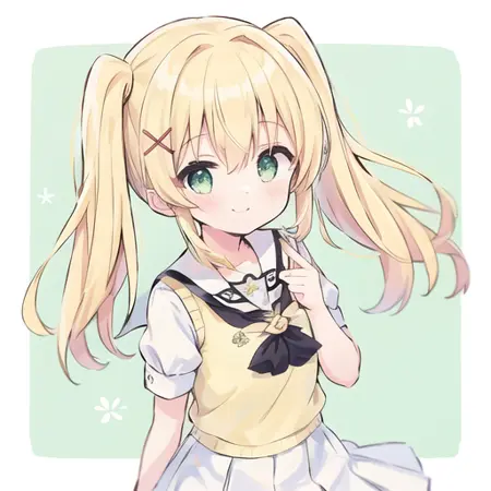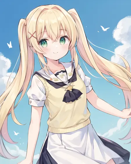 学制服:tsumugi、1人娘、金髪、ロングヘア、前髪、緑の目、ツインテール、xヘアオーナメント、短い袖、眉間の髪、視線を向ける、白いシャツ、笑顔、学制服、ほお紅、黄色いセーター、プリーツスカート、セーラー襟、白いスカート、ふわふわの短い袖、