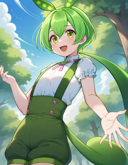 ずんだもん服装:背带短裤、白衬衫、颈带、绿色短裤、绿色鞋履、短裤、背带、短袖、蓬松袖子