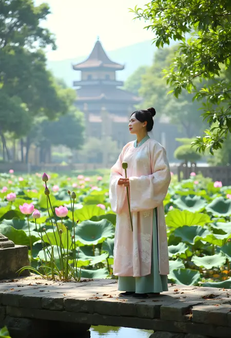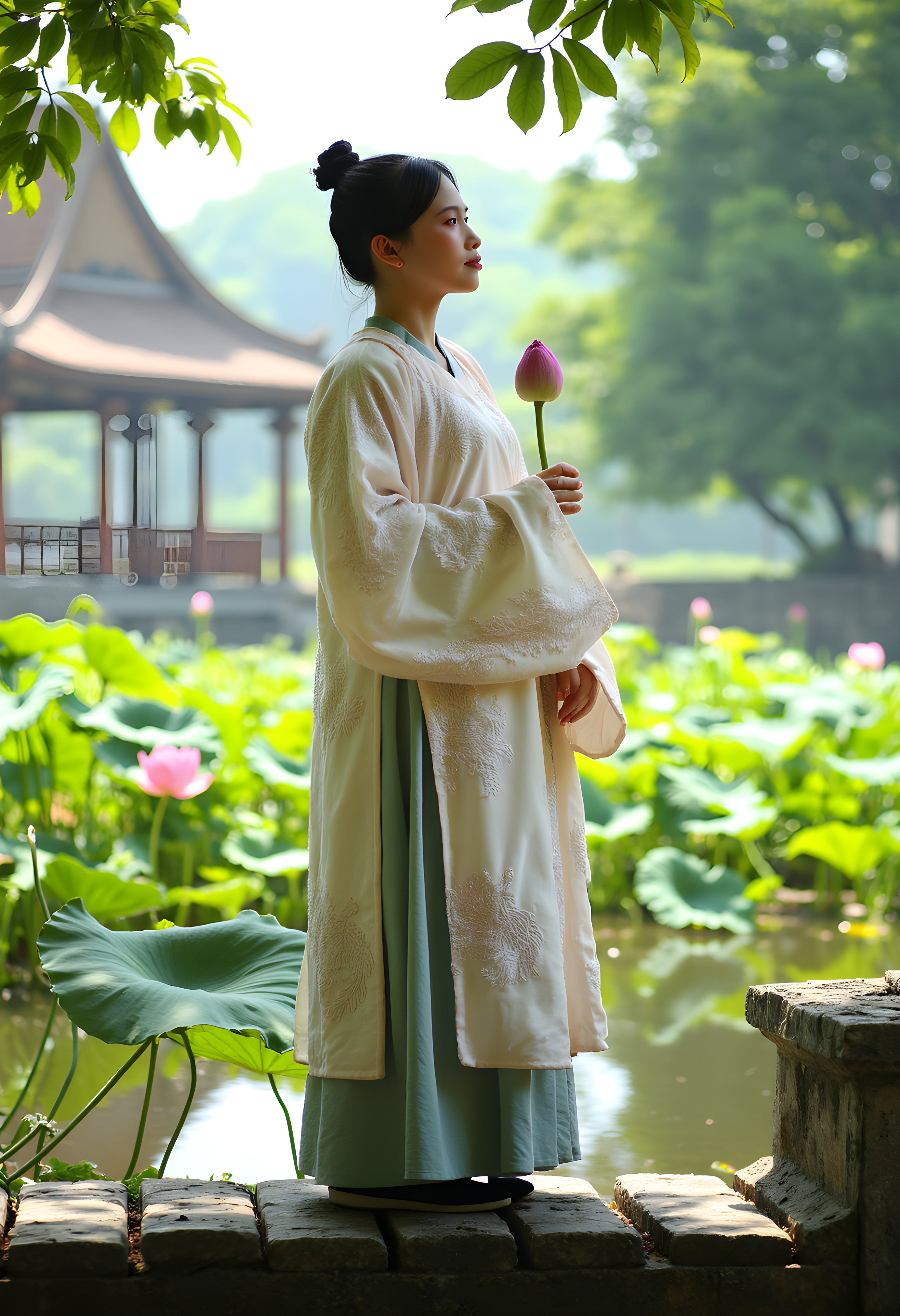 Ao Vien Linh,创作一幅高度细致的数字插画,描绘一位身着传统Viên Lĩnh长袍的年轻越南女性。长袍由奢华的丝绸制成,呈柔和象牙色,饰有精致的花卉刺绣和立体纹理,体现越南历史服饰的精湛工艺。长袍配有圆领和宽大飘逸的袖子,呈现出优雅而高贵的气质。女子优雅地站立在宁静的传统庭院中,背景是古老的建筑,沐浴在温暖的环境光下。她的神情平静而沉思,手中轻握一把精致的折扇。画面捕捉了越南文化遗产的精髓,展现了传统服饰的美丽与典雅。