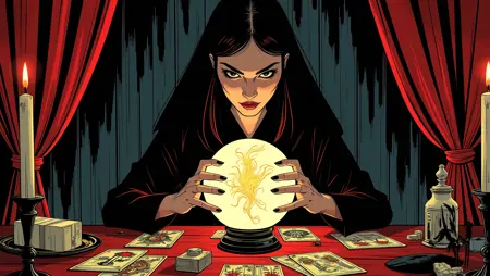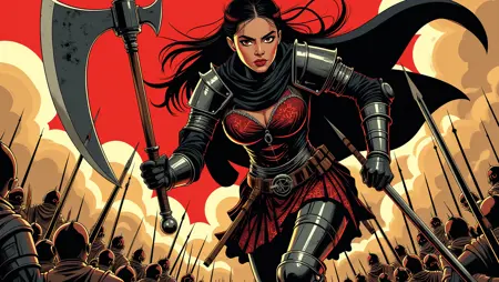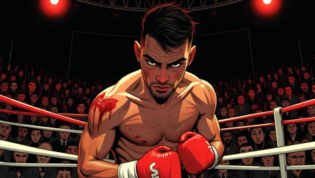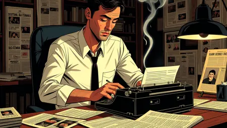 Vintage, cinematic, and bold, reminiscent of the classic pulp fiction era. It employs a strong use of contrasting colors, particularly reds and blacks, to create a dramatic and intense atmosphere. The characters are depicted with sharp, clean lines and exaggerated features, emphasizing a sense of tension and intrigue. The overall aesthetic draws inspiration from noir and comic book art, with a focus on storytelling through expressive characters and a moody, urban setting. The style captures the gritty, suspenseful essence of mid-20th-century pulp novels and graphic novels.
