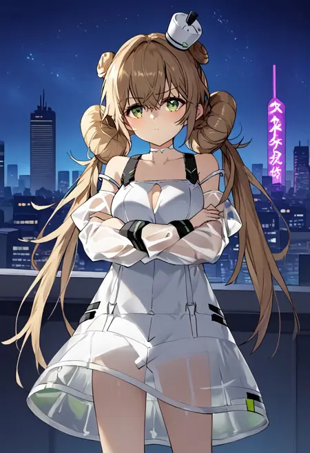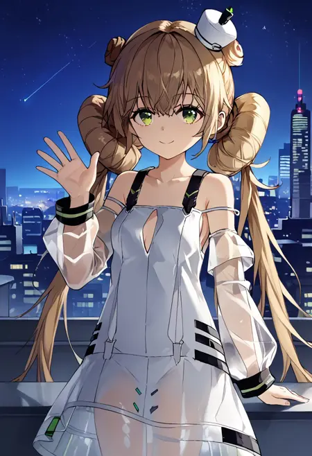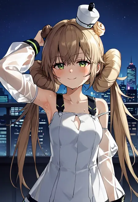 Head: AlyconeEucharist, long hair, green eyes, bangs, hair bun, very long hair, double bun, twintails, brown hair, hair between eyes, blonde hair, mini hat,
