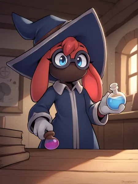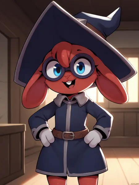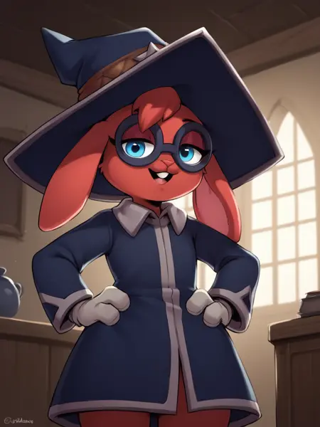 moji, leipori, rabbit, blue coat, blue hat, witch hat, glasses, gloves, blue eyes, 3 fingers, mask