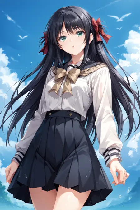 kazuna kouzuki, long hair, black hair, japanese clothes, yagasuri, skirt, kimono, , hakama, hakama skirt, bow, hair bow, ribbon, scarf, boots, green eyes
