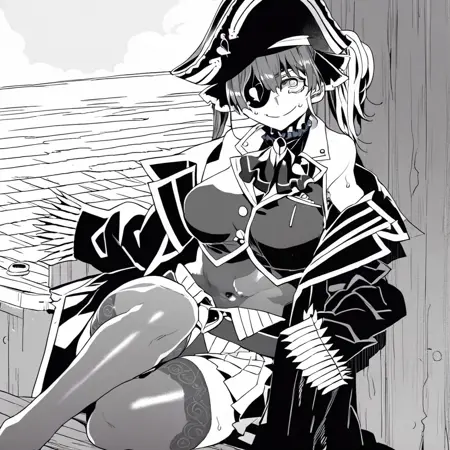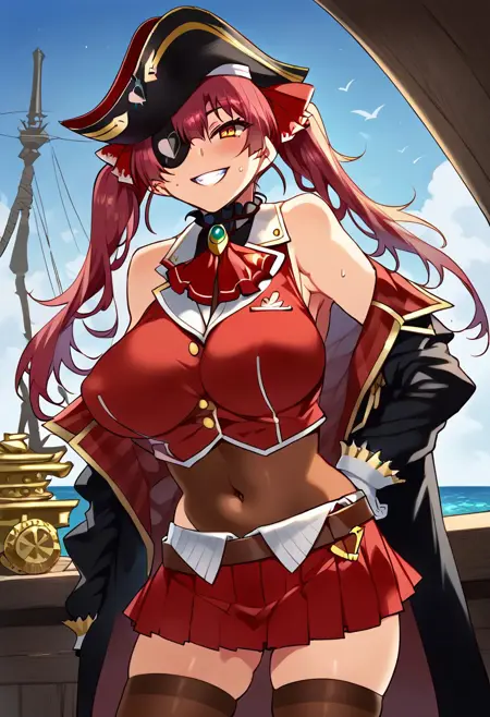 5. ((marine_pirate, black pirate hat with gold decoration, eyepatch on right eye, red left eye, red hair ribbon, black neck accessory, red ascot, sheer black leotard, sheer black thighhighs, pleated red skirt, brown belt, black coat with gold and red collar, sleeveless red top with white collar and gold decoration, bare shoulders, covered navel,))