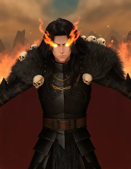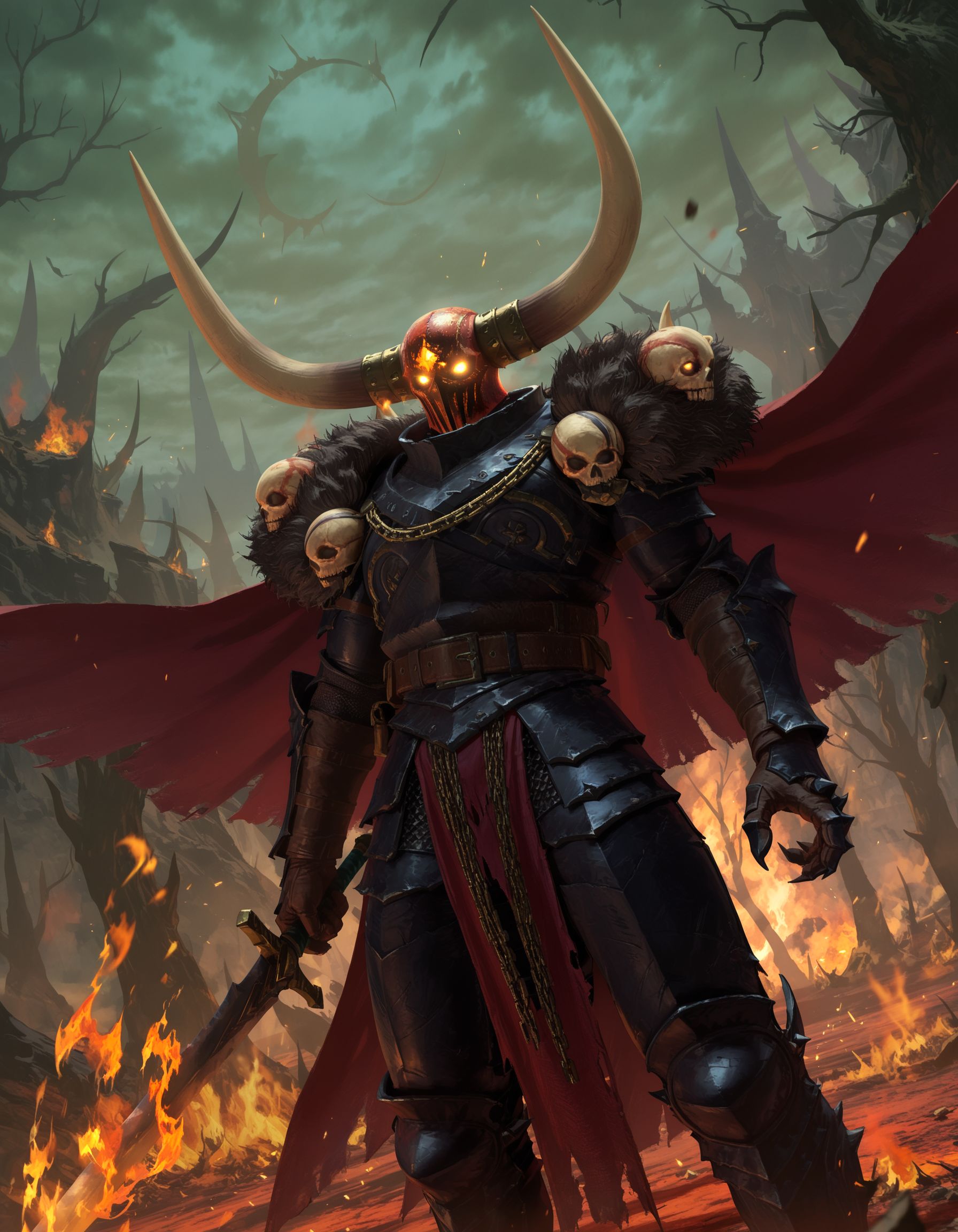 Archaon, horned helmet, armor, glowing eyes, solid eyes, cape, sword, shield,