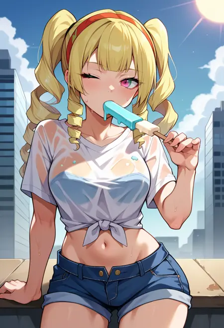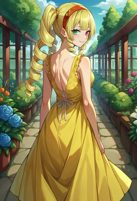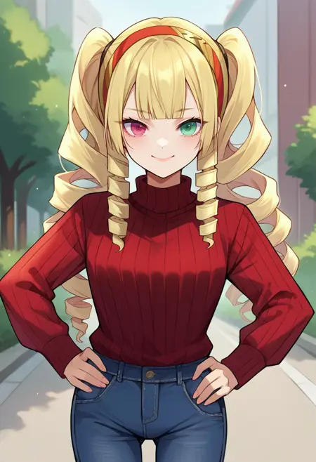 KoamiSumire, heterochromia, blonde hair, long hair, twintails, drill hair, red hairband