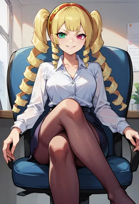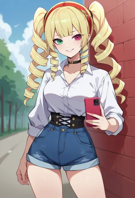 KoamiSumire, heterochromia, blonde hair, long hair, twintails, drill hair, red hairband, detached collar, brooch, blue capelet, white sailor collar, red bowtie, black corset, elbow gloves, red belt, blue skirt, black pantyhose, thighband pantyhose