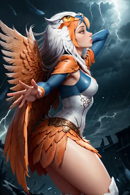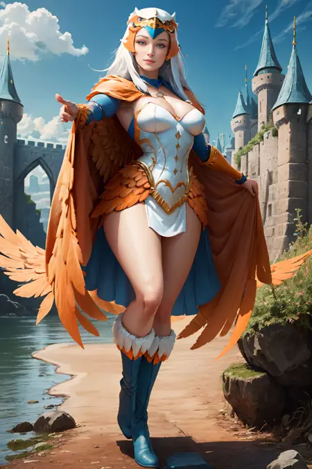 アクティベーションワードは「motu_sorceress」です。クラシックなビジュアルを演出するには、「青と白の長い袖のVネックボディスーツを着た美しくてヴェルベットのような女性、羽の装飾入りの青と白の長い袖のVネックボディスーツ、エイグルのヘッドドレス、オレンジ色の羽飾りのコート、白いファーがついた青のブーツ」と入力してください。これらのキーワードを省くと、汎用的なスーパーヒロイン/魔女のスタイルになりますが、それなりにクールな仕上がりになります。詳しい例は画像をご覧ください。