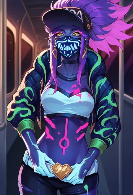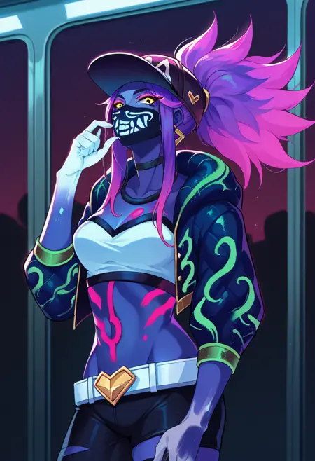 AkaliNeon, long hair, high ponytail, sidelocks, purple hair, glowing hair, yellow eyes, glowing, blue skin, white hands, bodypaint, neon lights, baseball cap, print cap, mouth mask, earrings, black choker, white tube top, midriff, black jacket, green paint on jacket, cropped jacket, white belt, black pants, single pantsleg, uneven legwear