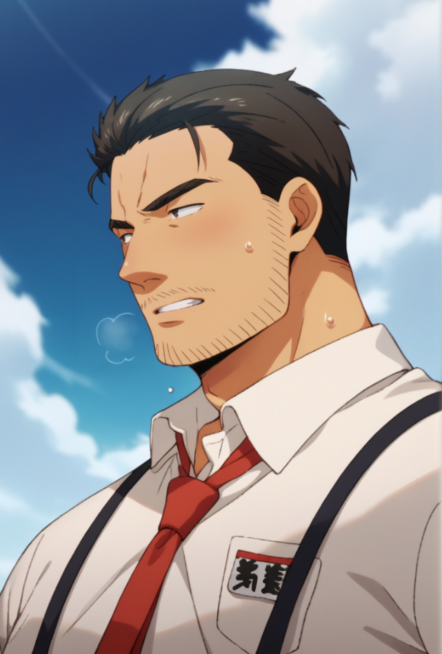 猪重,棕色眼睛,短棕色头发,胡茬,浓眉,胖男人,圆润身材,黑色裤子,白色衬衫,背带,红色领带, bara