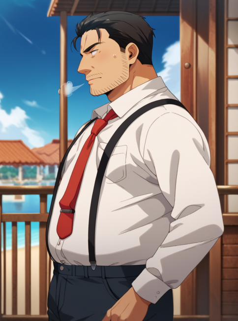 Inoshige , brown_eyes, short_brown_hair, stubble, thick eyebrows, fat man, chubby_body, black pants, white shirt, suspenders, red necktie, bara