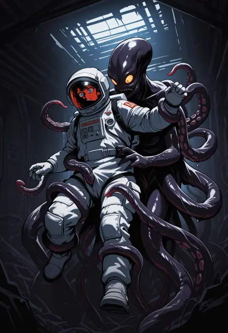 你可以通过提示“tentacle monster”来添加怪物,然后描述怪物,并在相关标签后加上“monster”。示例:"tentacle monster, giant octopus, pink monster"。
