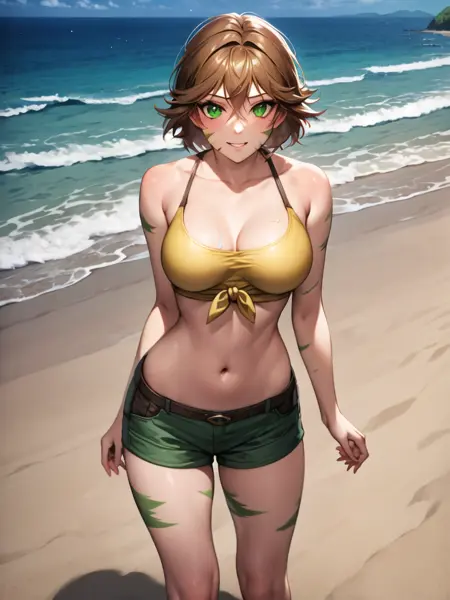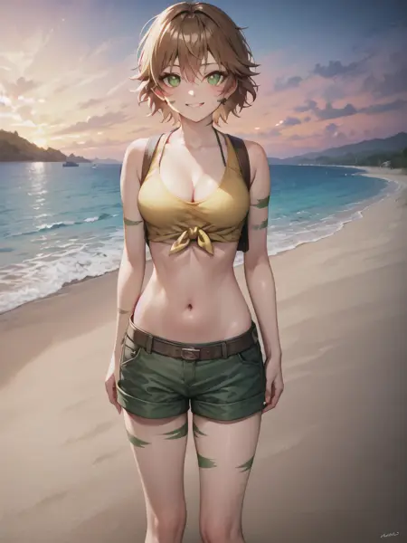 프롬프트 2: 도코 아마다, 녹색 눈, 단발, 갈색 머리, 흉터, 가슴, 묶인 셔츠, 허리, 배꼽, 초록색 반바지