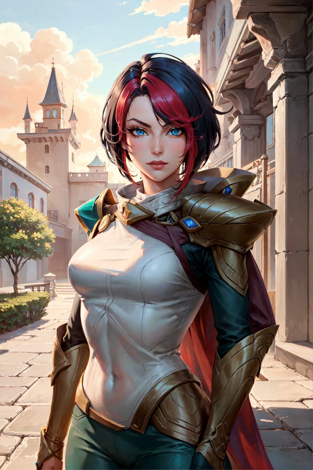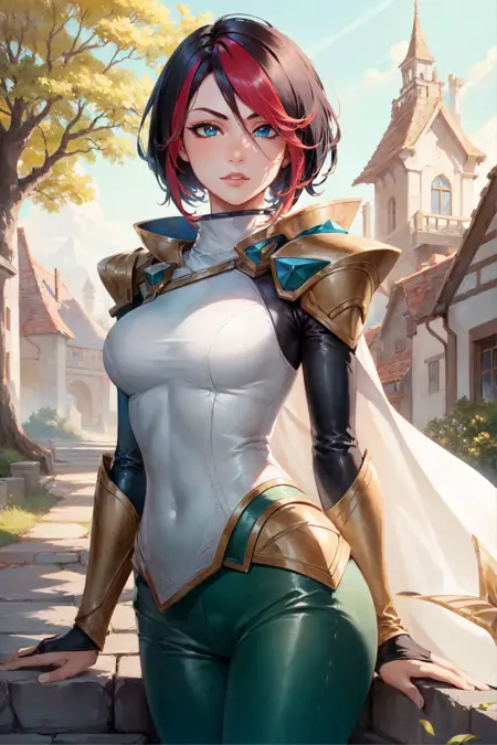 可选标签:渐变发色,白色紧身衣,绿色长裤,铠甲