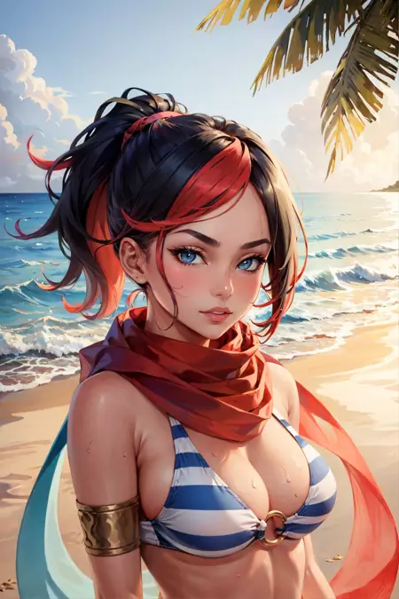 オプションタグ: ストライプビキニ、レッドショートパンツ、スカーフ、ポニーテール、マルチカラーの髪