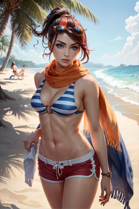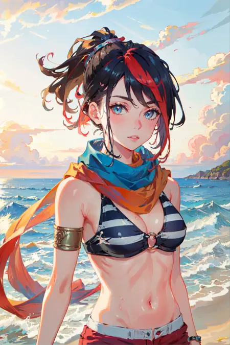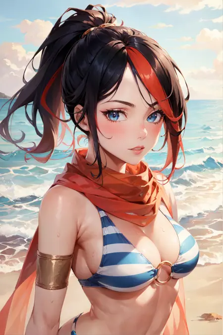 可选标签:条纹比基尼,红色短裤,围巾,马尾辫,彩色发色