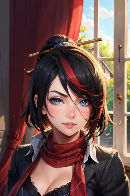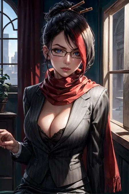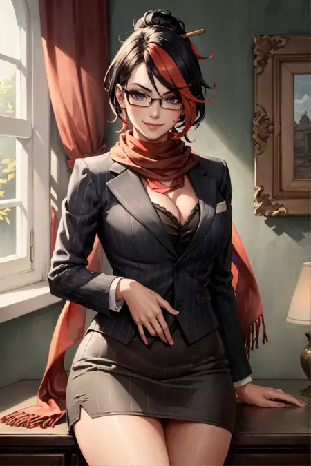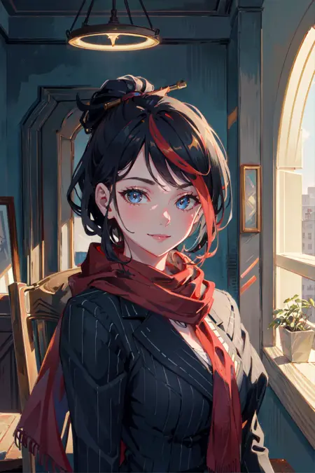 可选标签:条纹西装,裙子,红色围巾,彩色发色,发夹,黑色过膝长袜