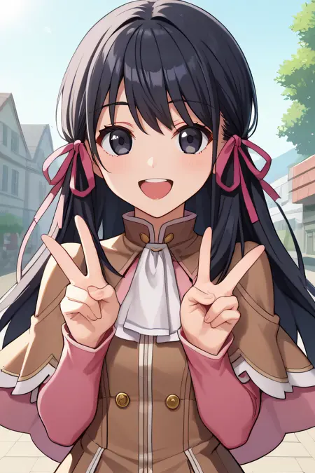 mana, black hair, black eyes, sidelocks, long hair, hair ribbon