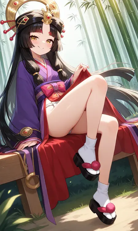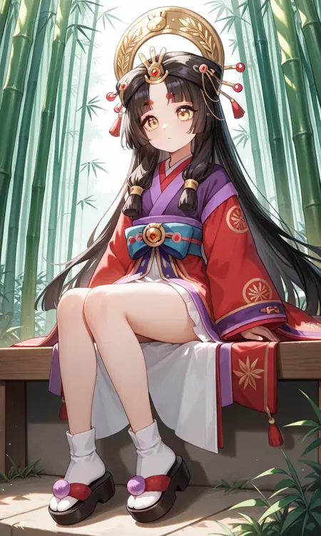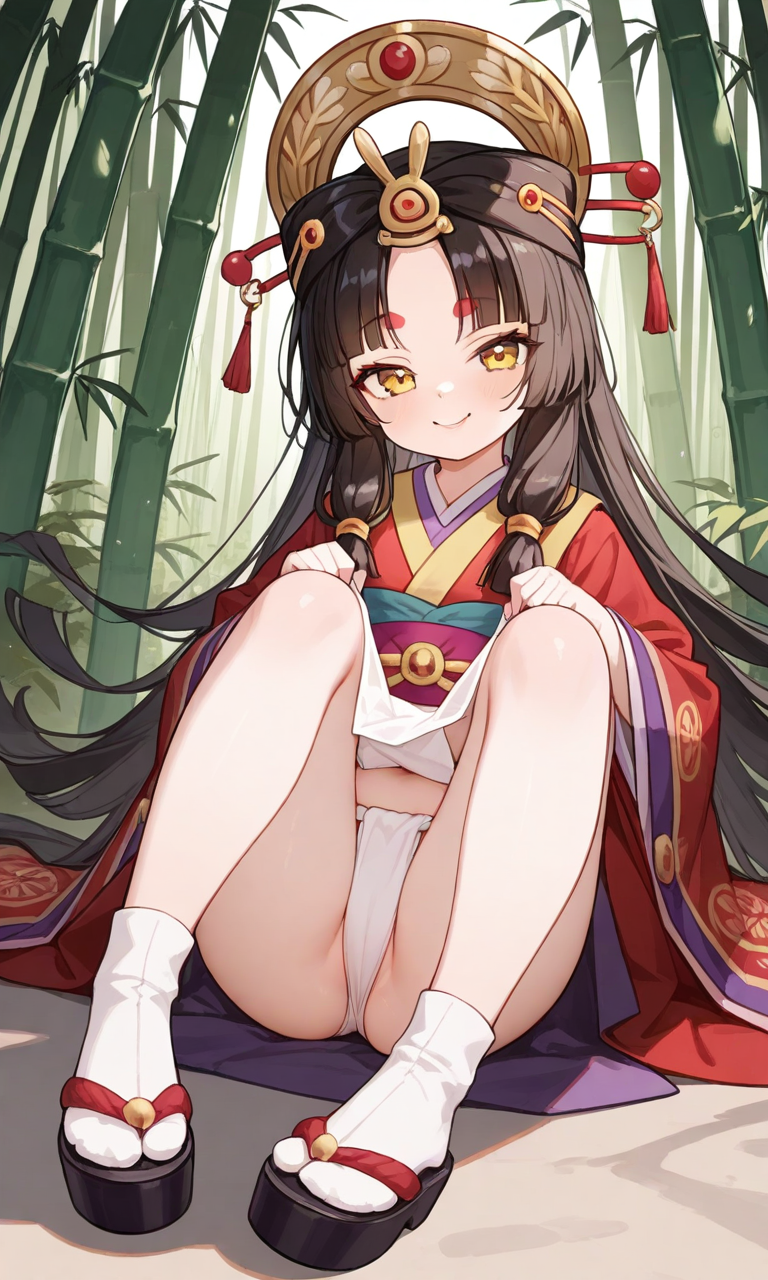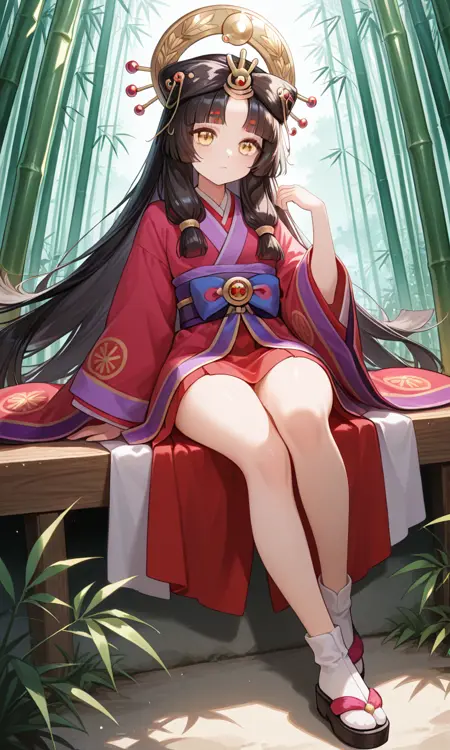 Kaguyahime, black hair, very long hair, bangs, split bangs, hair ornaments, yellow eyes, japanese clothes, magenta kimono, layered clothes, wide sleeve, sash, obi, white tabi, sandals