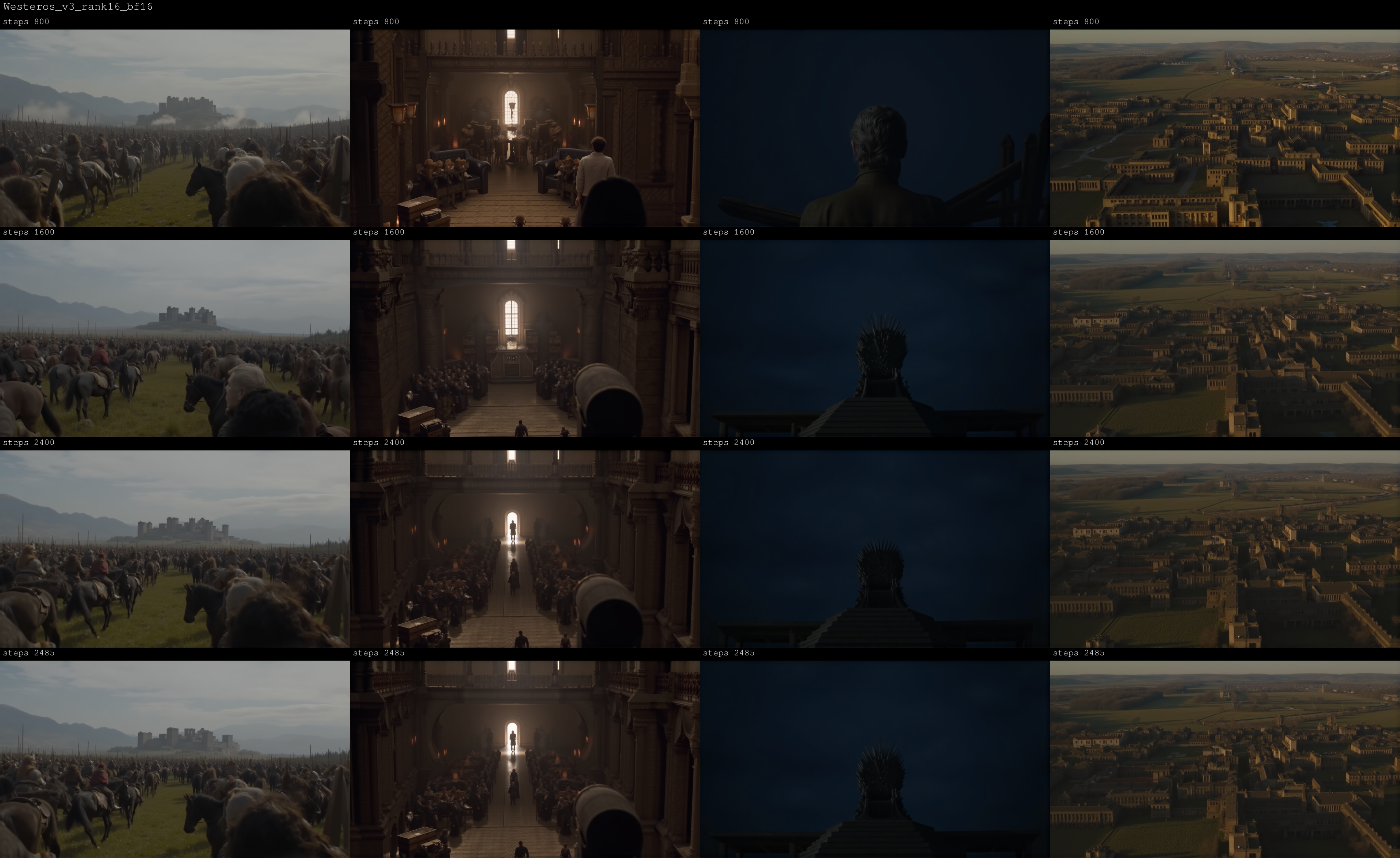 LoRA를 활성화하려면 키워드 Westeros, Game of Thrones, Fantasy를 사용하세요.