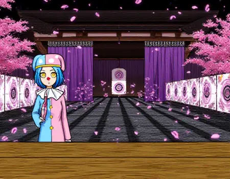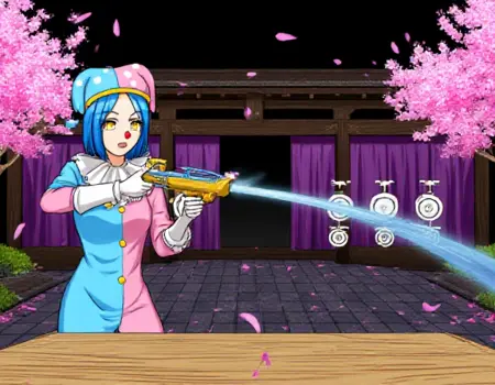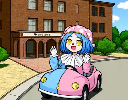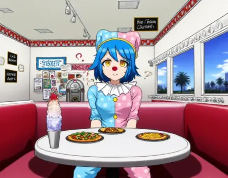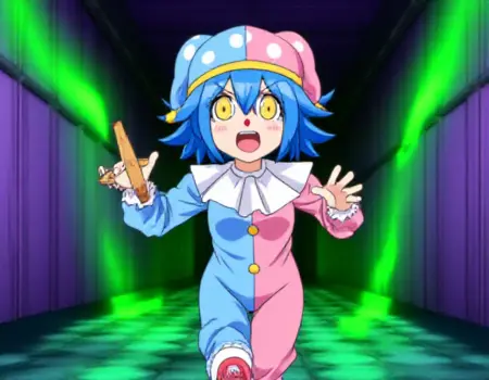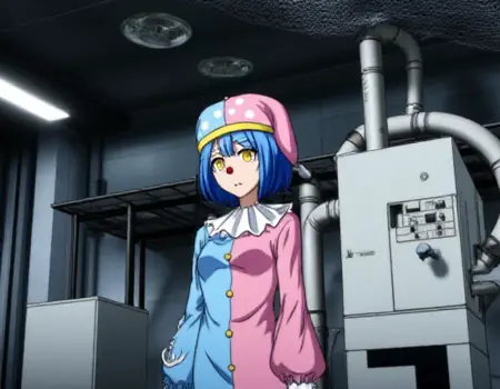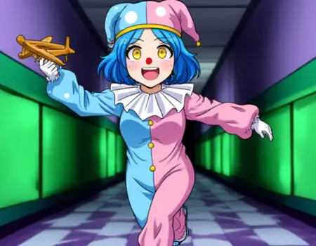 标准小丑装: “Satsuki Iranami身穿一件垂直对半分的双色小丑装,左侧为蓝色,右侧为粉色,配以同款小丑帽,帽上有白色圆点和黄色饰带。她的服装带有白色褶边领口、前襟黄色纽扣和卷曲的鞋子。Satsuki留着短蓝色头发,拥有醒目的黄色眼睛,戴着红色小丑鼻子。”