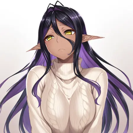 yellow eyes, black hair, purple hair, streaked hair, multicolored hair, long hair, sidelocks, antenna hair, dark elf, dark skin,